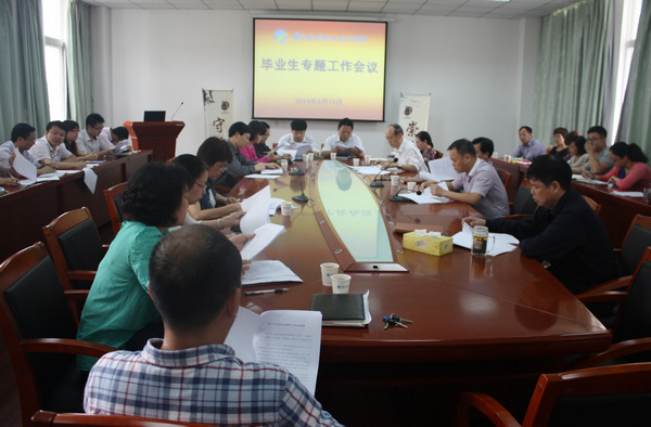 本网讯(党政办 文/图 张建新)5月13日下午,学院在三楼会议室召开2014届毕业生专题工作会议,学院党政领导和科级以上干部参加了会议。会议由院长潘飞南主持,学生处处长王华勤就2014届毕业生离校工作作了详细安排,副院长林茂溪强调了四点意见。