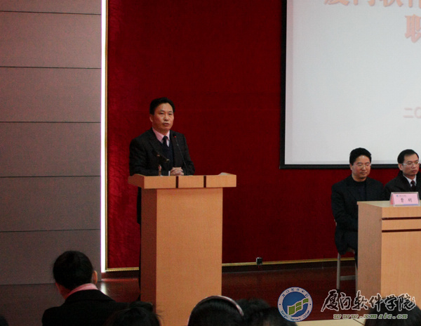 随后,黄理事长分析了学院面临的形势和任务,进一步明确了学院今后的办学方向,同时也对学院领导班子提出了工作要求。黄理事长说,厦门软件在短短的四年时间里,边办学、边建校、边发展,在校企合作、毕业生就业工作等方面都取得较好的成绩。这是举办方、投资方,原行政领导班子、党委班子艰辛付出的成果。要把一所学校办好,一是靠好生源,二是靠好教师。厦门软件有地域的优势,有行业的优势,同时有厦门理工作为坚强的后盾,对生源吸引也是一个优势。学院的领导班子要巧用资源,制定政策,在高职院校激烈的竞争局面当中,脱颖而出,使我们教师的素质、结构、数量更能符合培养高素质人才的要求。同时,厦门市政府和市领导的重视,也是今后办好厦门软件的利好因素和坚强的后盾。在未来的一段时间里面,学院应着重扩大办学规模、注重内涵建设、提高办学层次、提升学校形象。厦门理工将不遗余力地提供各项优质资源,为厦门软件的办学做保障。