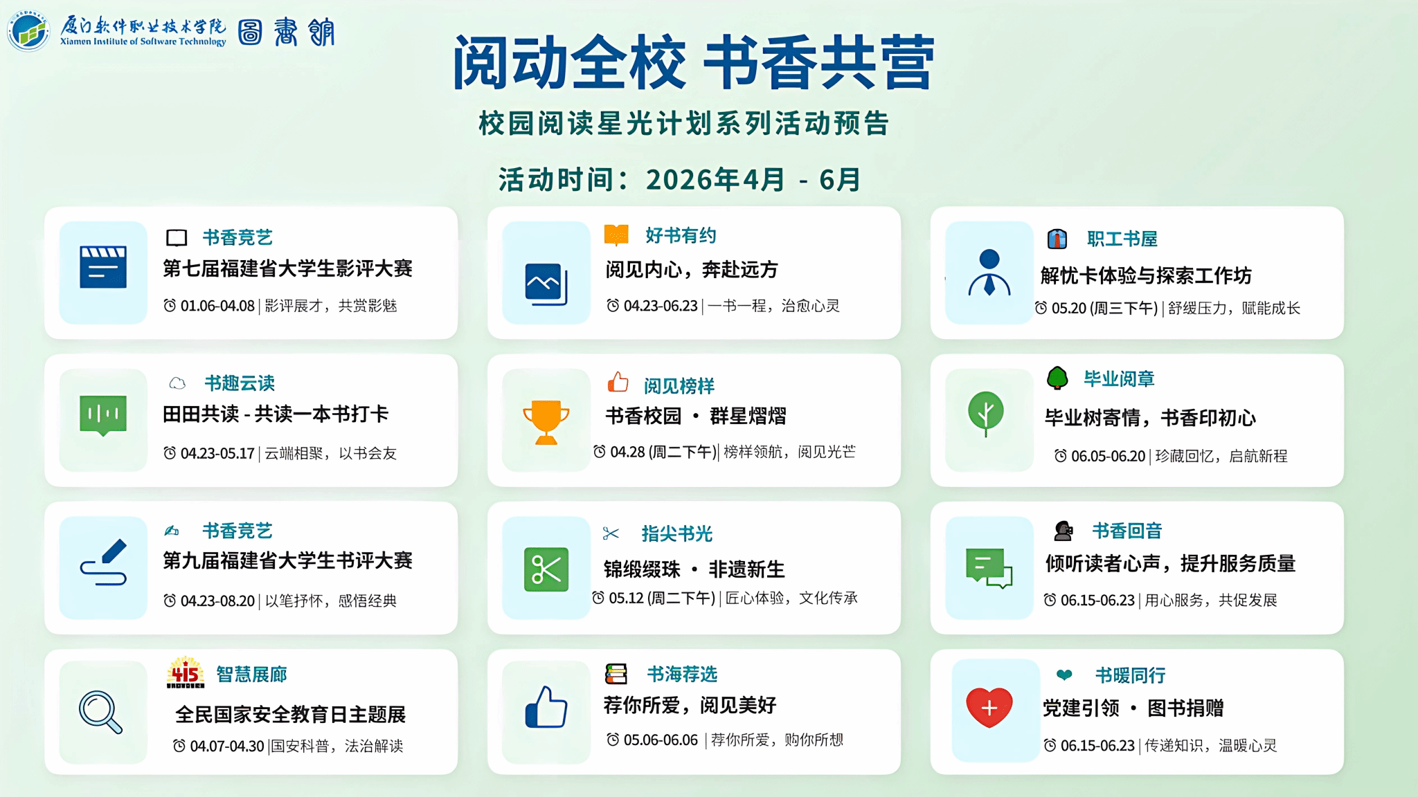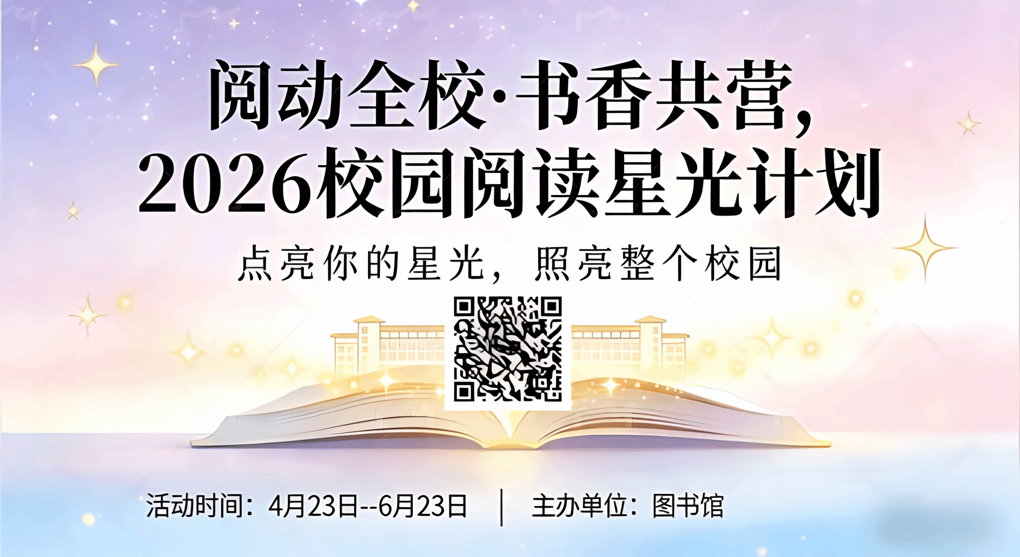 在这春意盎然的季节里,我们即将迎来第31个“4·23世界读书日”。2026年2月,《全民阅读促进条例》正式颁布实施,全民阅读上升为国家战略。为深入贯彻落实条例精神,搭建师生阅读交流平台,推动书香校园建设。图书馆精心策划了“阅动全校 书香共营”校园阅读星光计划系列活动。