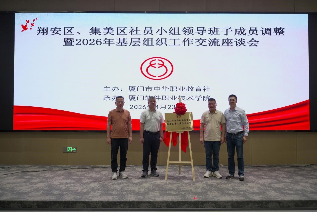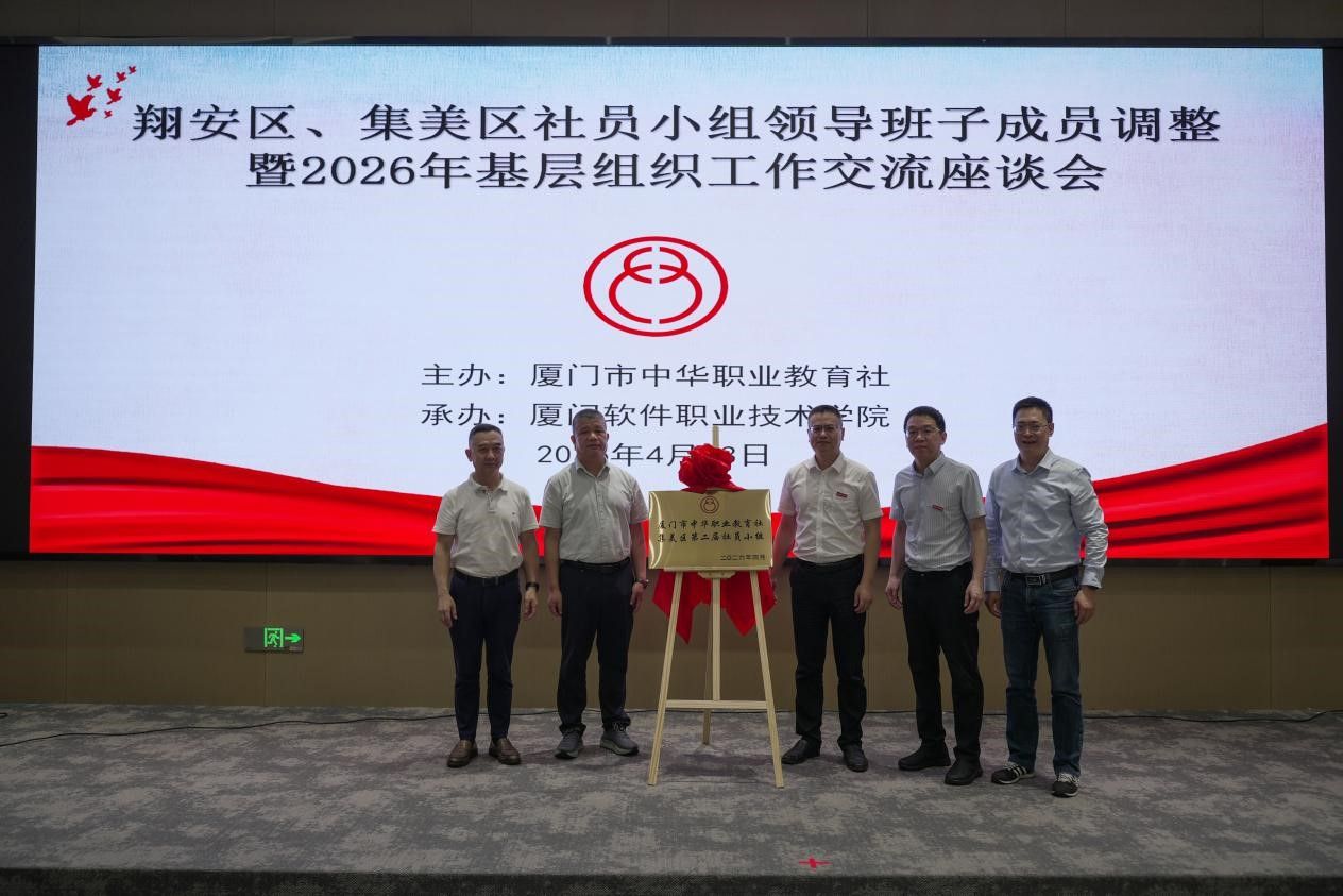 4月23日,厦门市中华职业教育社在厦门软件职业技术学院召开“翔安区、集美区社员小组领导班子成员调整暨2026年基层组织工作交流座谈会”。两区社员小组新老领导班子成员,各团体职业院校“社员之家”分管领导、教师骨干及社员代表等近30人参加会议。厦门市中华职业教育社副主任张培和,集美区委统战部常务副部长、区侨办主任谢乐峰,翔安区委统战部干部朱开清参加会议,会议由厦门市中华职教社专职副秘书长纪志斌主持。