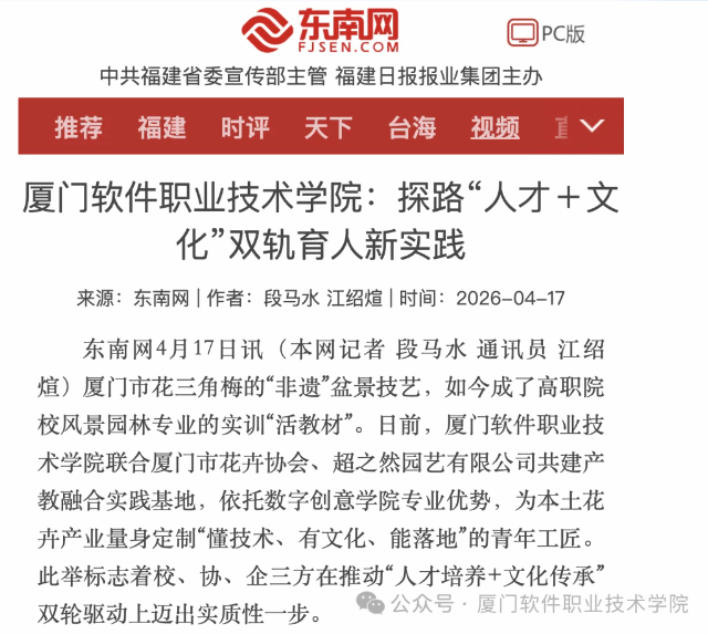 近日,我校数字创意学院风景园林设计专业与厦门市花卉协会、厦门市超之然园艺有限公司共建产教融合实践基地的合作项目,引发社会媒体广泛关注。福建日报报业集团旗下重点新闻门户东南网率先刊发报道,随后北青网、网易新闻、腾讯新闻、MSN新闻等多家国内主流网络媒体相继转载,充分肯定了我校深化产教融合、创新人才培养模式的实践成果。