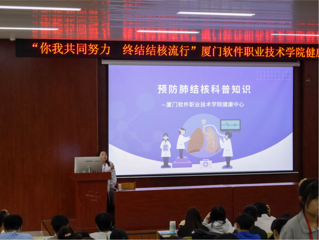 一是在学生社区开展“世界防治结核病日”主题宣传活动,通过现场发放宣传单,设立咨询服务台,让学校师生对防治结核病有个清晰的认识;二是在教学楼多功能厅F202开展结核病防治主题教育讲座。通过专业宣讲,现场互动,让师生对结核病有更全面、系统的认识,提高对传染病的防范意识。三是通过悬挂条幅,张贴海报,公众号科普推文,积极营造宣传氛围。