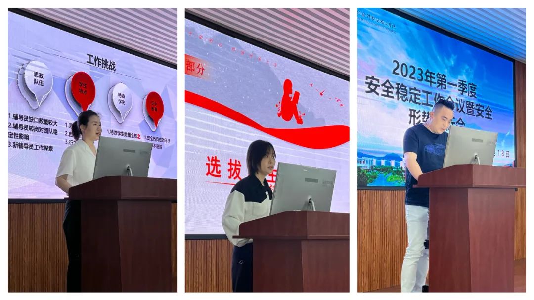 会上,数字创意学院党总支书记肖梦云、软件工程学院辅导员钟璐结合本职工作,就如何做好学生安全管理做经验分享;保卫处副处长陈冬阳分析了2022年度警情,通报2023年第一季度警情统计。