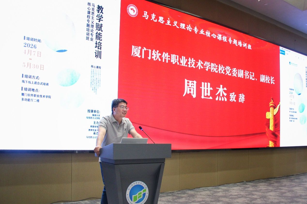 周副书记在致辞中强调,学校始终高度重视思政教师队伍建设。本次培训特邀集美大学马克思主义学院提供专业支撑,采用线上线下混合式教学模式,为思政教师搭建系统学习、深度研修的平台。他希望全体参训教师以此次培训为起点,持续深化理论学习,锤炼教学本领,打造有深度、有温度、有力度的思政“金课”,为培养高素质技术技能人才筑牢思想根基。