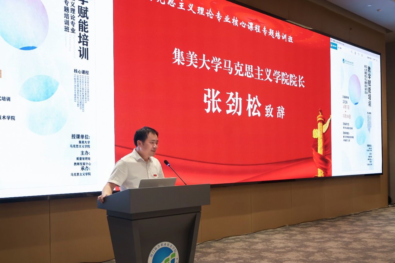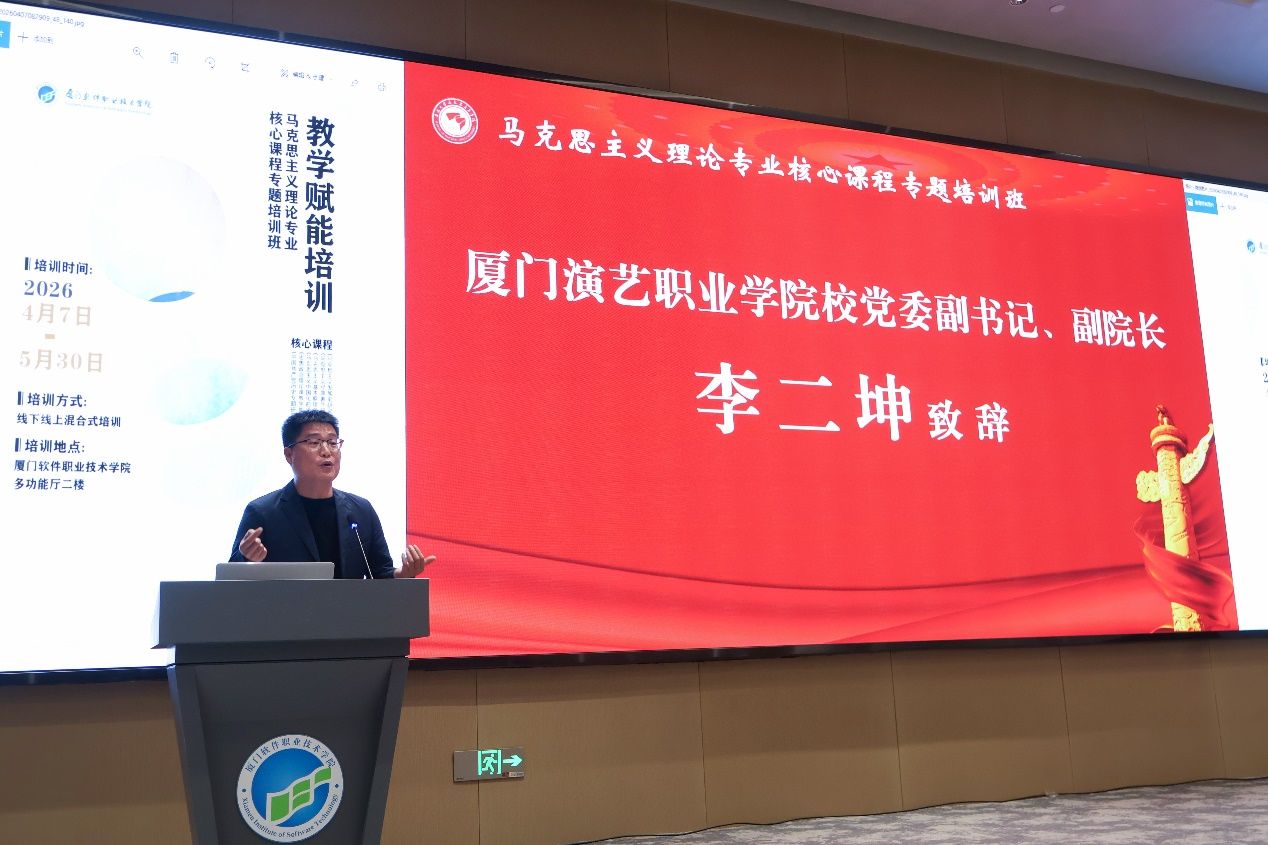 为深入贯彻习近平新时代中国特色社会主义思想,落实立德树人根本任务,进一步加强思政课教师队伍建设, 4月7日,马克思主义理论核心课程专题培训班开班仪式在我校隆重举行。本次教学赋能培训特邀集美大学马克思主义学院全程授课,厦门演艺职业学院共同参训,助力思政课教师专业成长。集美大学马克思主义学院院长张劲松,我校党委副书记、副校长周世杰,厦门演艺职业学院党委副书记、副院长李二坤出席仪式并致辞。两校共44名思政骨干教师参训。